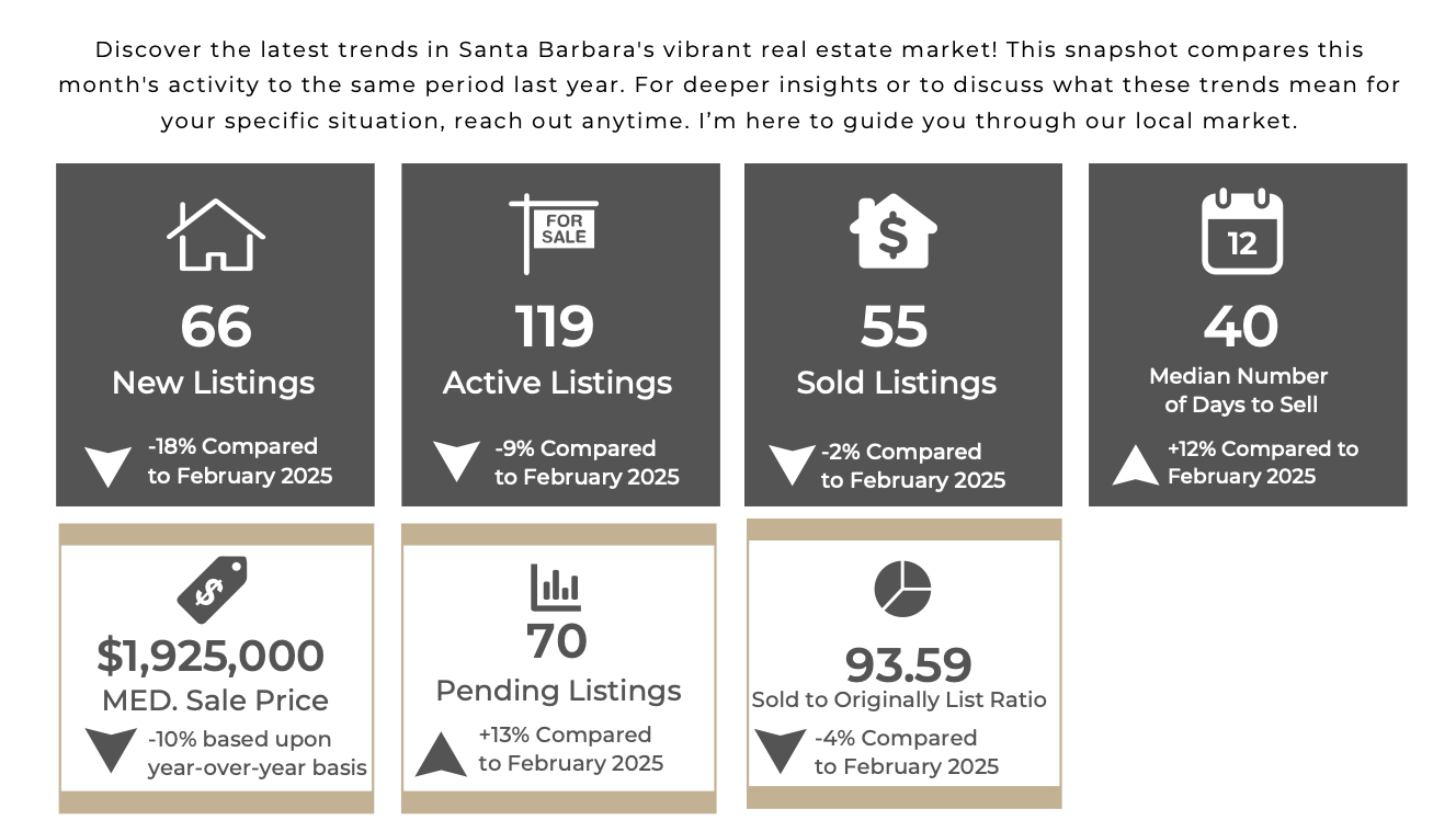 The most recent data for the Santa Barbara single-family housing market (excluding Montecito and Hope Ranch) suggests a market that remains active but requires thoughtful strategy from both buyers and sellers. Buyer demand is still present, as homes continue to go under contract at a healthy pace despite fewer new listings entering the market. Limited inventory means well-prepared homes in desirable neighborhoods can still attract strong attention when priced appropriately. Buyers are taking slightly more time to make decisions, which creates opportunities to evaluate properties more carefully rather than feeling rushed. Pricing strategy has become increasingly important, as homes are not always achieving their original asking price, making realistic positioning essential for sellers who want strong activity. For buyers, this environment can offer opportunities for more thoughtful negotiations compared to the highly competitive conditions of previous years. For homeowners considering selling, preparation, presentation, and strategic pricing remain key factors that can significantly influence the outcome of a sale. Overall, the Santa Barbara housing market continues to be highly neighborhood-specific, meaning property value and market activity can vary meaningfully from one area to another.